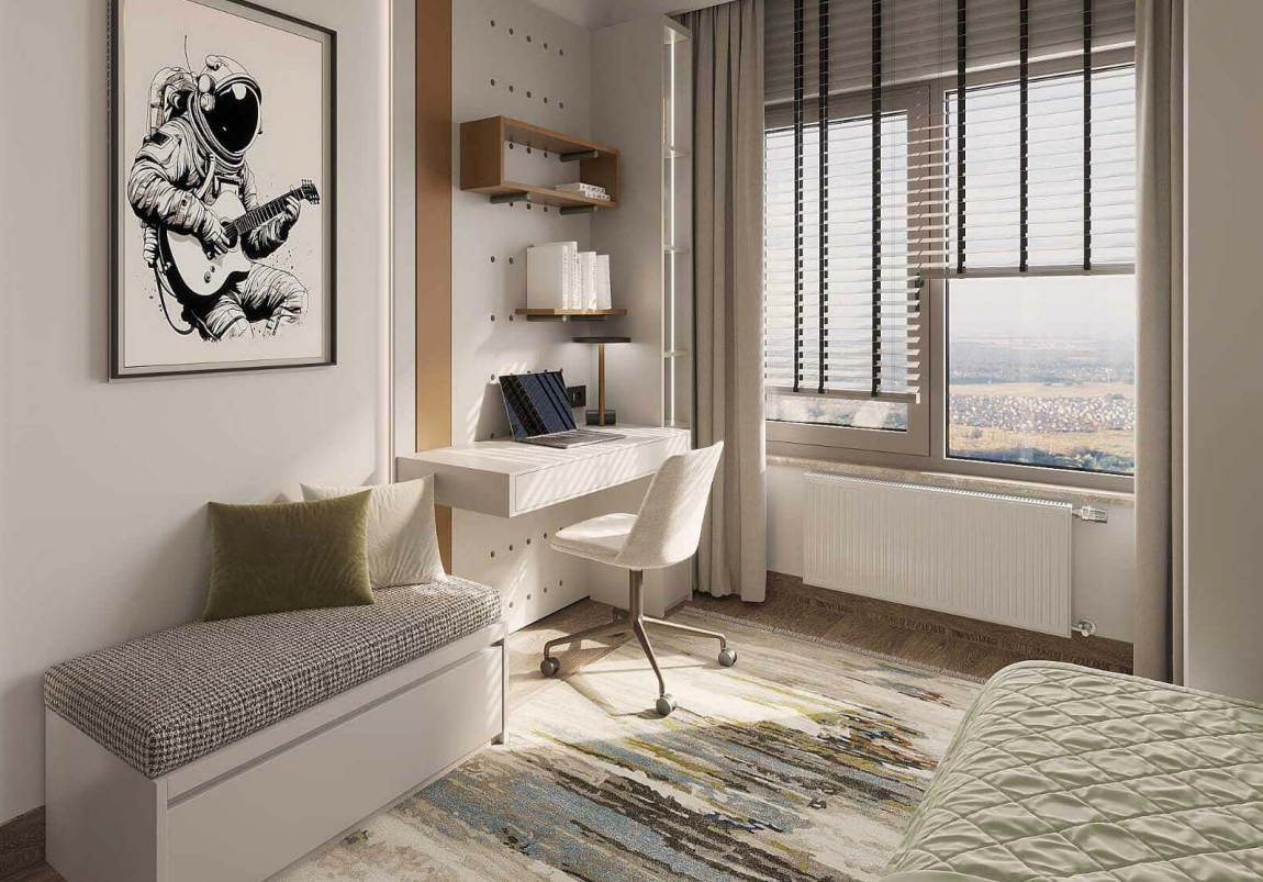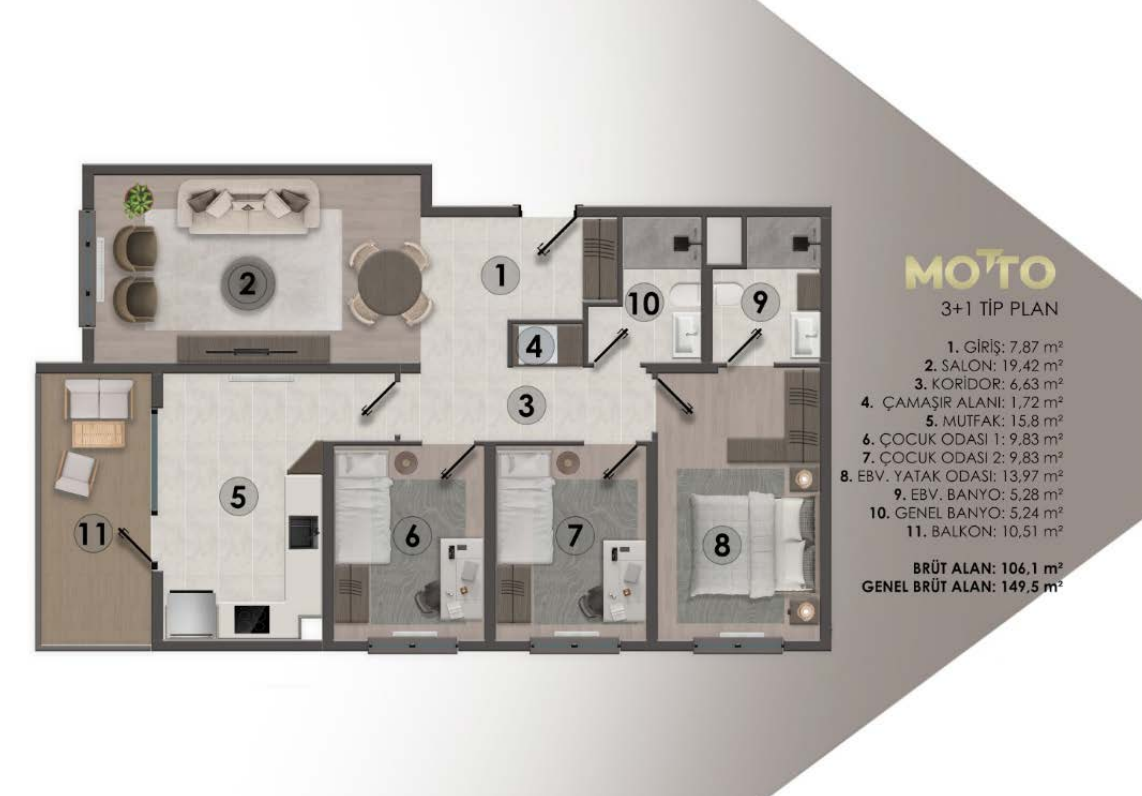 3+1 dairelerimiz kapalı mutfak konsepti ile geliştirilmekte olup ebeveyn banyosuna ek olarak genel banyo bulunan