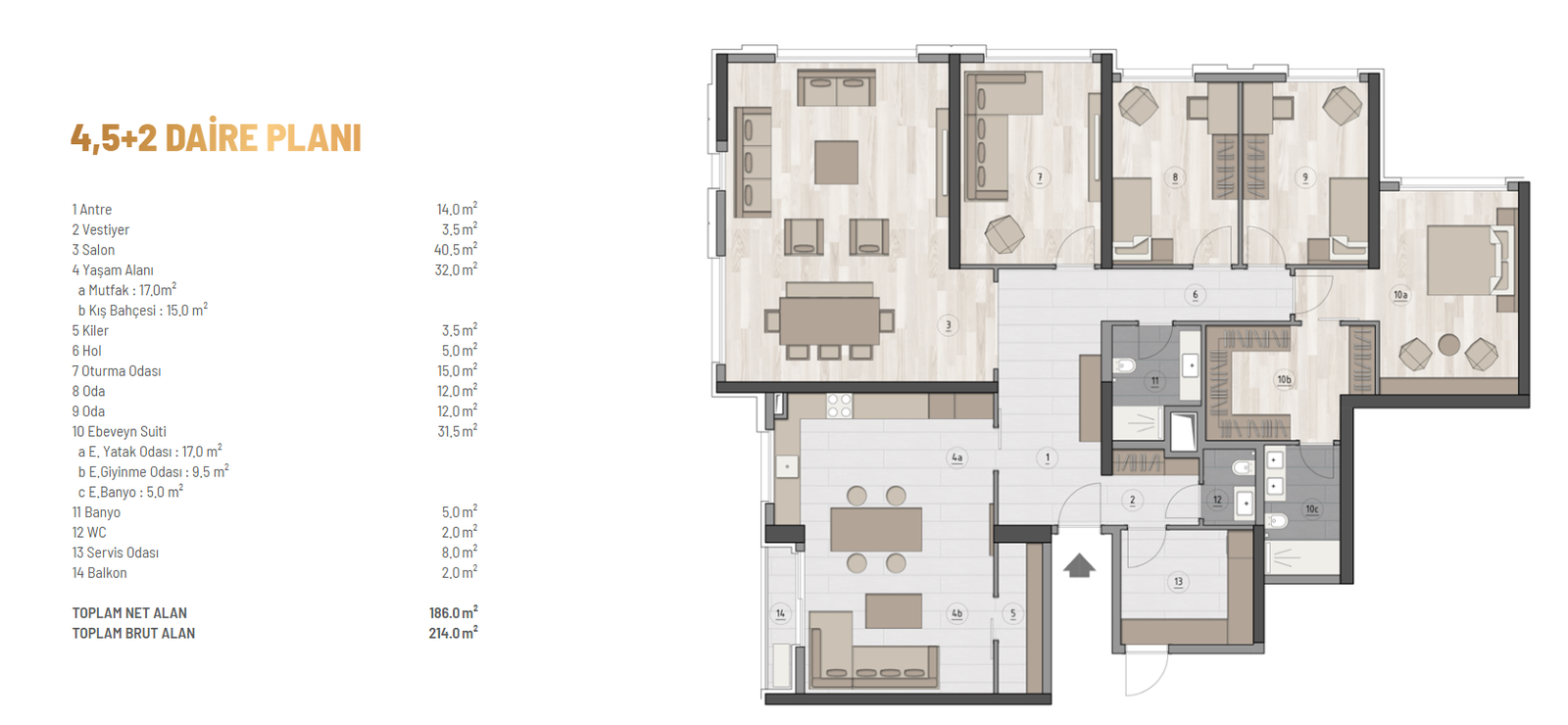 • Brüt Kullanım Alanı: 210 m²