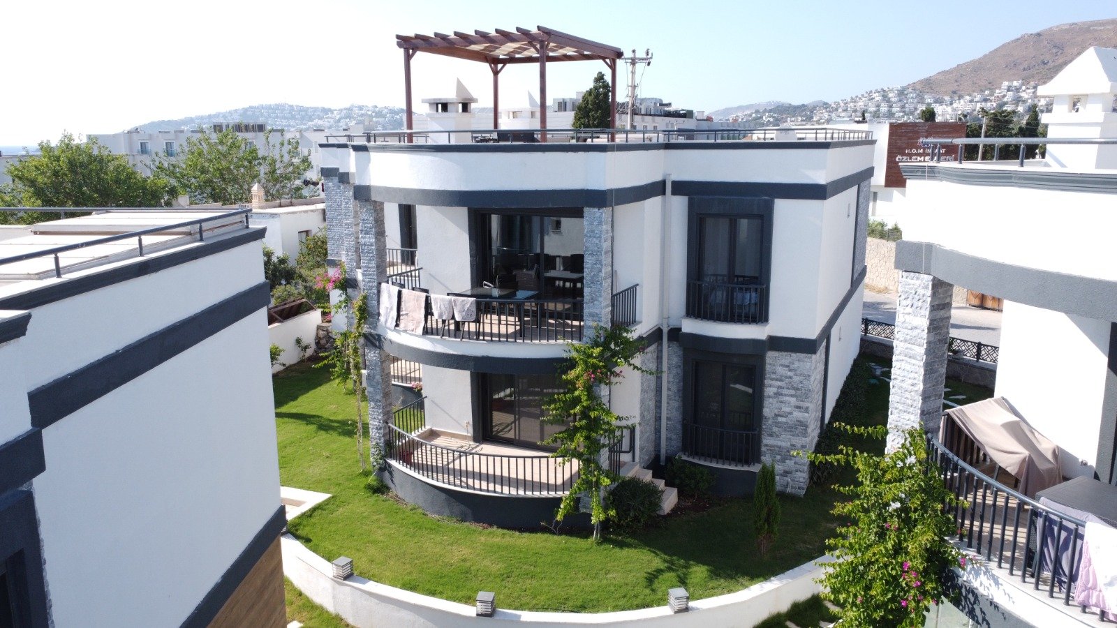 Bodrum Turgutreis’te denize sıfır, teraslı satılık daire. Teras 90m²’dir ve tamamen daireye aittir. Teras içerisinde daireye ait gazebo bulunmaktadır.